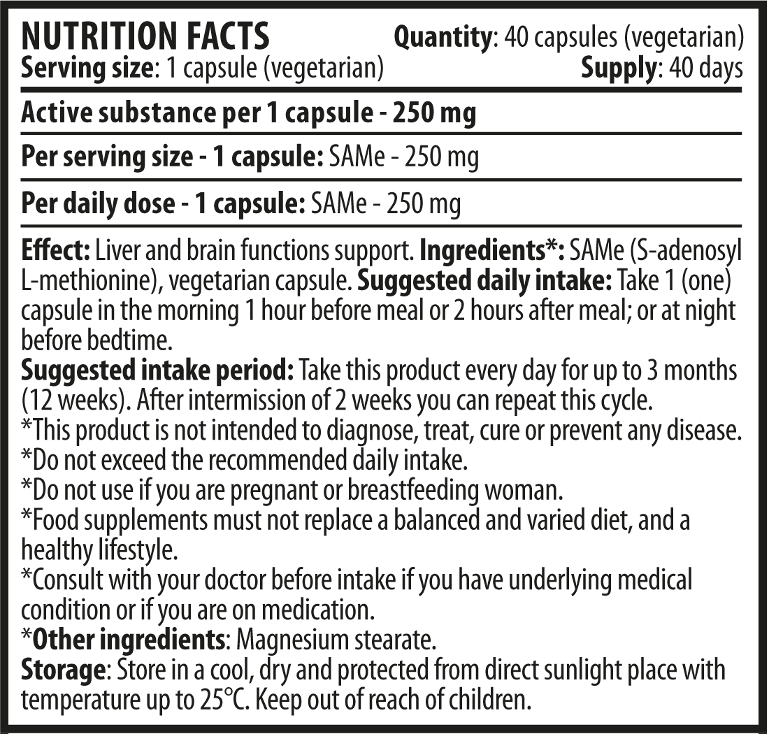 Съставки: SAMe (S-adenosyl L-methionine), вегетарианска капсула, магнезиев стеарат