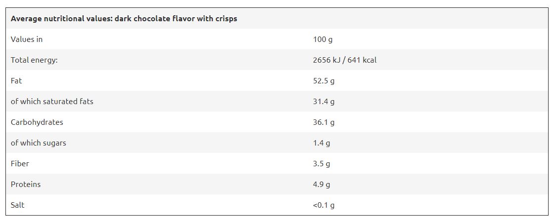 Съставки: Растителна мазнина (ший и кокосово масло в различни пропорции); Протеинова смес 19,3% (частично хидролизиран изолат на суроватъчен протеин CFM® (от мляко) - HydroVon® и изолат от млечен протеин), сгъстители: Sta-Lite® полидекстроза нискокалорични влакна и инулин, лешникова паста 16%, какао на прах, подсладител : сукралоза, аромат.