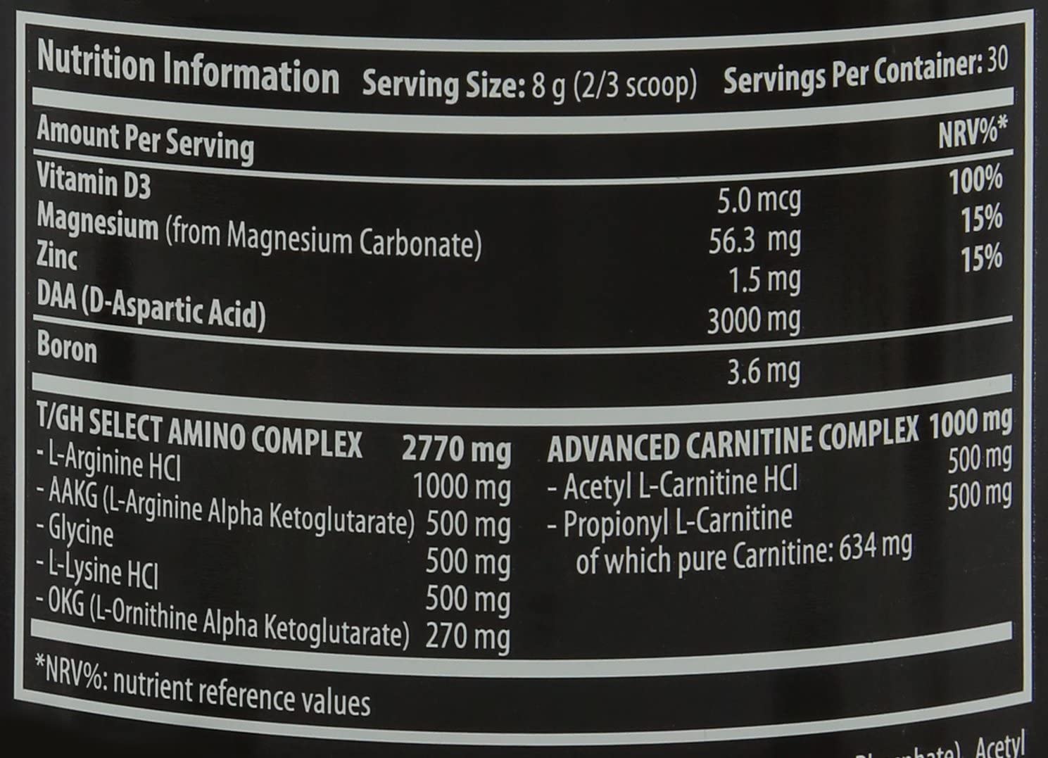 SCITEC T/GH съдържа 12 мощни съставки, сред които DAA (D-аспарагинова киселина) и карнитини под формата на пропионил L-карнитин и ацетил L-карнитин. AKG версии на аргинин и орнитин също са включени в аминокомплекса. Освен това съдържа витамин D3, бор и други основни минерали, а цинкът подпомага поддържането на нормални нива на тестостерон в кръвта и допринася за нормалната плодовитост и репродуктивност.