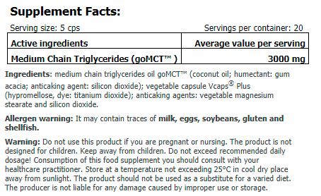 Съставки: средноверижно триглицеридно масло goMCT ™ (кокосово масло; овлажнител: смола акация; средство против слепване: силициев диоксид); растителна капсула Vcaps® Plus (хипромелоза, багрило: титанов диоксид); средства против слепване: растителен магнезиев стеарат и силициев диоксид