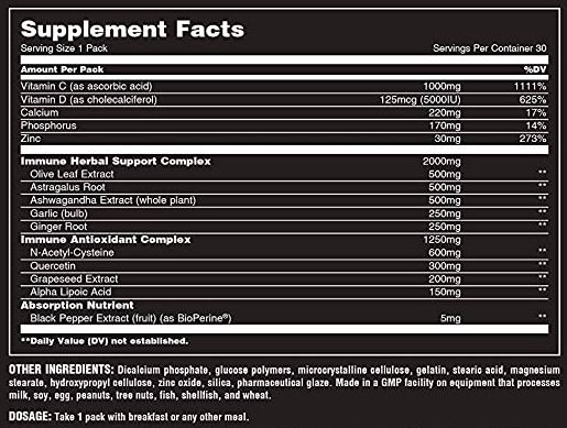 Съставки: Vitamin C (as ascorobic acid), Vitamin D (as cholecalciferol), Calcium, Phosphorus, Zinc, Olive leaf extract, Astragalus Root, Ashwagandha extract (whole plant), Garlic, Ginger root, N-acetyl-cysteine, Quercetin, Grape Seed Extract, Alpha Lipoic Acid, Black Pepper Extract (Fruit) (as BioPerine)