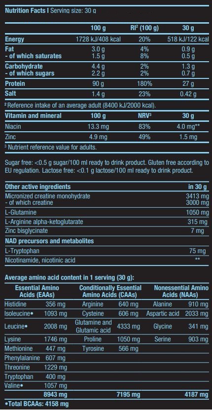 ванилия: суроватъчен протеин изолат 77% [суроватъчен протеин изолат, емулгатор: лецитини (соя)], микронизиран креатин монохидрат 11,4%, L-глутамин, ароматизанти, сметана [частично хидрогенирана кокосова мазнина, обезмаслено мляко на прах, емулгатори (E471, E472a), глюкозен сироп, захароза, млечен протеин, стабилизатор (потасиумфосфати), средство против слепване (калциеви фосфати)], L-аргинин алфа-кетоглутарат, емулгатор: лецитини (соя), сгъстители (карагенан, ксантанова смола), сол, против слепване агент (силициев диоксид), L-триптофан, подсладител (сукралоза), цинкбисглицинат, никотинамид, никотинова киселина, оцветител (тартразин) 4.