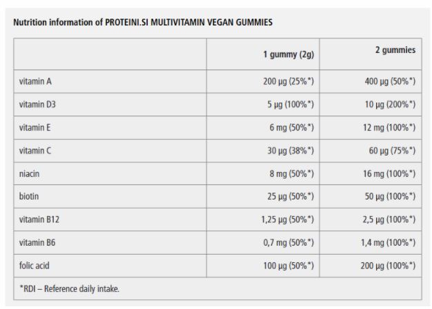 Multivitamin Gummies от Proteini.si е първокласен мултивитаминен комплекс под формата на гумени мечета с плодов вкус, предназначен за деца. Подходящ е за деца от 4 годишна възраст нагоре и основната му функция е да подсилва имунната система. Не съдържа захар и е 100% веган.