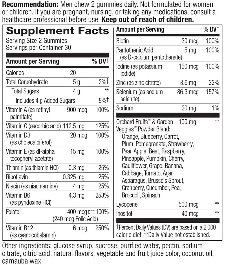 Съставки: Витамин А, Витамин С, Витамин D3, Витамин Е, Тиамин, Рибофлавин, Ниацин, Витамин В6, Фолиева киселина, Витамин В12, Биотин, Пантотенова киселина, Йод, Цинк, Селен, Содиум, Orchard Fruits ™ & Garden Veggie ™ прахообразна смес: Портокал, Боровинка, Морков, Нар, Слива, Ягода, Круша, Ябълка, Цвекло, Малина, Череша, Ананас, Тиква, Карфиол, Грозде, Асаи, Аспержи, Банан, Броколи, Брюкселско зеле, Зеле, Червена боровинка, Краставица, Грах, Спанак , Домат; Ликопен, Холин, Инозитол