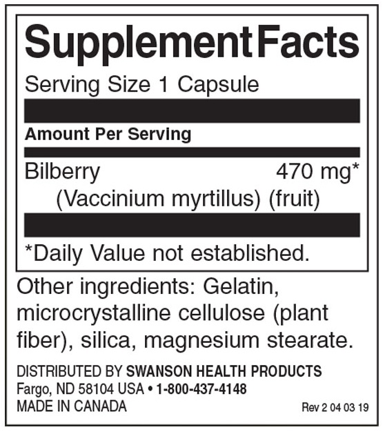 SWANSON Bilberry Fruit 470 mg / 100 Caps е хранителна добавка, под формата на капсули, съдържаща висококачествена Европейска боровинка, която подобрява състоянието на очите.