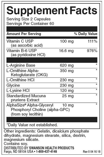 Съставки: Витамин С USP (като аскорбинова киселина), Витамин B6 USP (като пиридоксин HCl), L-аргинин база, L-орнитин алфа-кетоглутарат (OKG), L-орнитин HCl, глицин, L-лизин HCl, стандартизиран екстракт от Mucuna pruriens, AlphaSize® алфа-глицерил фосфорил холин (алфа-GPC) (от соев лецитин)