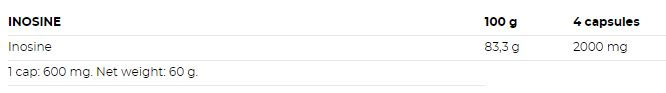 500 mg инозин в една капсула. Инозинът е вещество, оказващо директно влияние на много процеси, свързани с постигането на резултати, особено от гледна точка на издръжливостта. Инозинът увеличава производството на един от основните източници на енергия - АТФ. Поддържа функционирането на сърдечно-съдовата система и благодарение на това снабдява мускулите с кислород и хранителни вещества. Едно от основните свойство е именно доставката на кислород до тъканта.