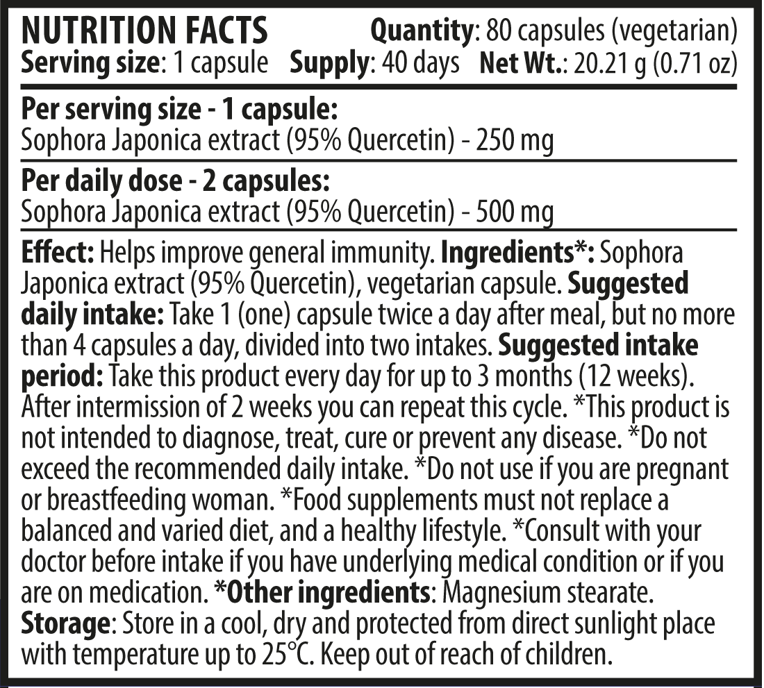 Съставки: Японска Софора (Sophora Japonica) екстракт ( 95% Кверцетин), вегатарианска капсула