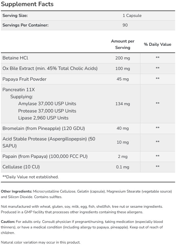 Съставки: папаин, панкреатин, бромелаин, папая - прах от плод, калций, бетаин хидрохлорид