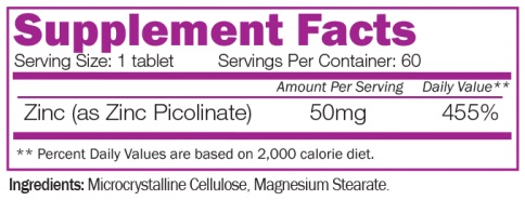 Съставки: Цинк (пиколинат), Микрокристална целулоза, магнезиев стеарат (растителен клас)