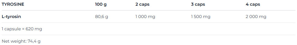 Л – Тирозинът е и основа за образуването на хормоните на щитовидната жлеза. При постоянен напредък във физическото и психическото състояние на организма, се наблюдава дефицит на невротрансмитери (преносители на нервни импулси), което влияе зле на концентрацията и цялостното ви състояние, в резултат на което настъпва постоянна умора. Продуктът помага да подобрите умствената си дейност. Друго полезно действие на тази аминокиселина е, че тя участва в механизъм за повишаване използването на енергия от мастните тъкани – „вторичен фет бърнър”.