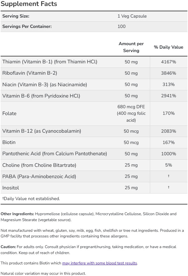 NOW Vitamin B-50 / 100 Vcaps действа в подкрепа на сърцето, психичното здраве и енергийния метаболизъм. Действа синергично и осигурява на тялото всички витамини от групата В, за да гарантира максимално ефективно действие.