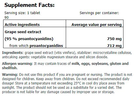 Съставки: екстракт от гроздови семки (vitis vinifera), стабилизатор: микрокристална целулоза, противослепващи агенти: растителен магнезиев стеарат и силициев диоксид