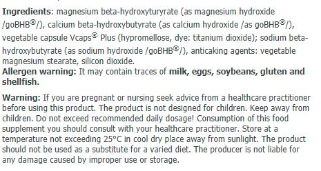 Съставки: магнезиев бета-хидрокситурират (като магнезиев хидроксид / goBHB® /), калциев бета-хидроксибутират (като калциев хидроксид / като goBHB® /), растителна капсула Vcaps® Plus (хипромелоза, багрило: титанов диоксид); натриев бета-хидроксибутират (като натриев хидроксид / goBHB® /), противослепващи агенти: растителен магнезиев стеарат, силициев диоксид