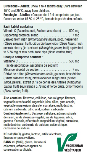 Съставки: Витамин C, Декстроза, растителна стеаринова киселина, зеленчуков магнезиев стеарат сукралоза, силициев диоксид, натурални аромати.