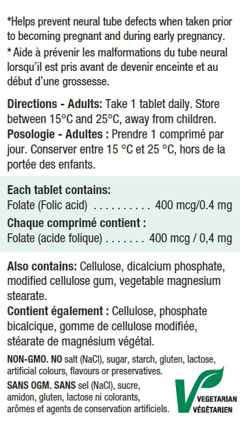 Съставки: фолиева киселина, целулоза, бикалциев фосфот, натриева кроскармелоза, растителен магнезиев стеарат, силикат