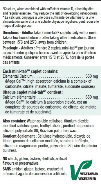 Съставки: елементарен калций (Mega Cal™, калций с висока абсорбция е комплекс от карбонат, цитрат, малеат, фумарат, източници на сукцинат), малтодекстрин, водоразтворима целулоза, минерално масло, титаниев диоксид, емулгатор: глицерин; модифицирана целулозна смола, триетилцитрат, пречистен магнезиев силикат, полисорбат 80, восък от бразилска палма