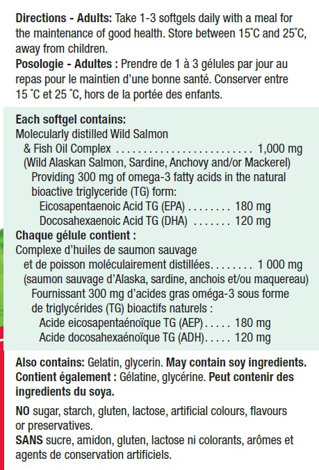 Съставки: Дива сьомга и комплекс от рибено масло, Омега 3 мастни киселини, Eicosapentanoic Acid TG, DHA (Docosahexanoic Acid TG), желатин, глицерин