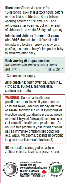 JAMIESON Probiotic Baby / 8 ml е течна хранителна добавка, специално предназначена за бебета от 1 месец до 3 години, която подпомага правилното функциониране на стомашно-чревния тракт.