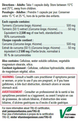 JAMIESON Curcumin Turmeric 550 mg / 60 Vcaps представлява мощен антиоксидант, който стимулира естествените защитни сили на организма и намалява риска от сърдечно-съдови заболявания. Освен това забавя признаците на стареене и подобрява вида на кожата.