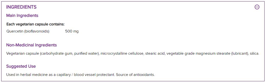 Webber Naturals съдържа концентриран източник на биофлавоноида кверцетин в лесни за преглъщане вегетариански капсули. Кверцетинът е източник на антиоксиданти и подпомага здравословното функциониране на дихателната, синусовата и имунната система. Той също така подпомага правилното използване на витамин С.