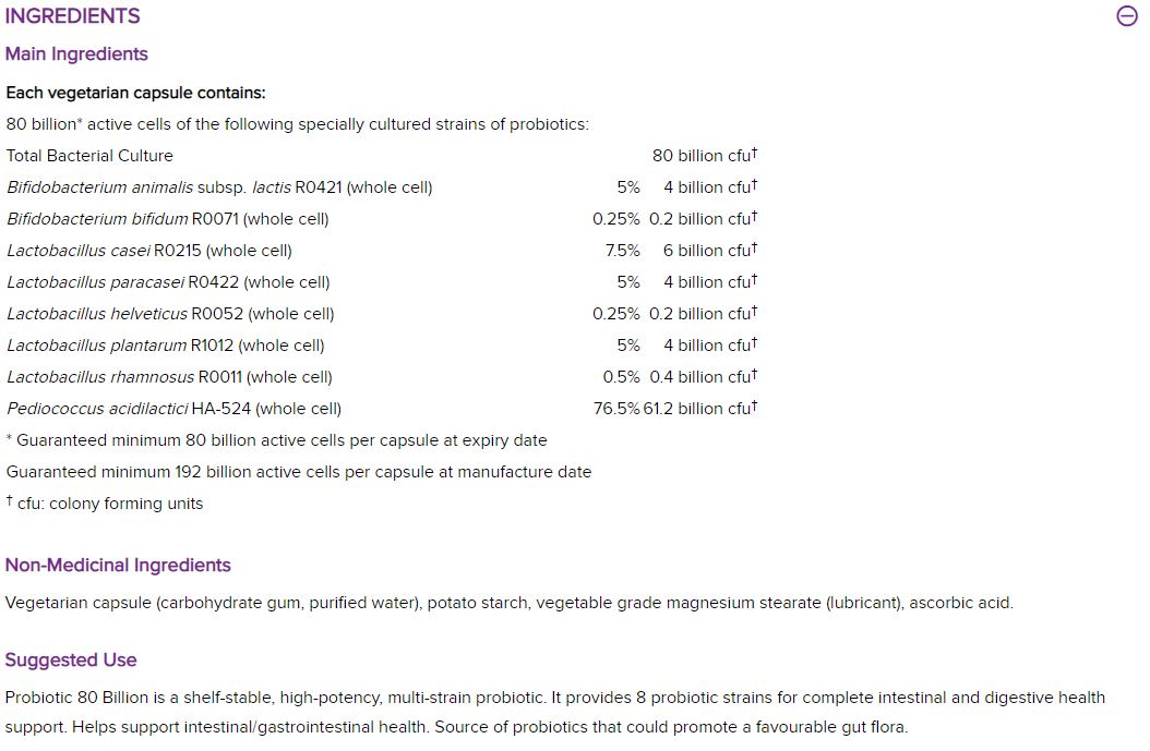 Пробиотик 80 милиарда съдържа 8 оптимални щама за здравето на червата: 5 щама лактобацили за грижа за тънките черва, 2 щама бифидобактерии за грижа за дебелото черво и 1 щам педиококус за подкрепа на храносмилането. Тези щамове са устойчиви на стомашна киселина, така че са в състояние да достигнат до чревния тракт. Освен това тези капсули са устойчиви на съхранение, което означава, че не се нуждаят от охлаждане, а блистерната опаковка е идеална за работа или пътуване!