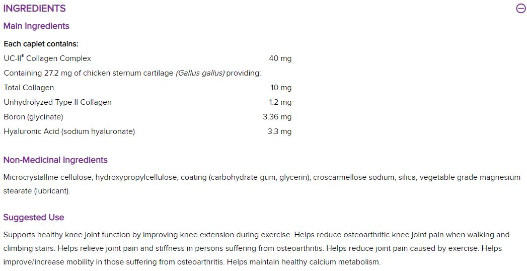 UC-II® е патентована форма на колаген тип II, който играе важна роля в образуването на ставния хрущял. Клинични проучвания показват, че той спомага за облекчаване на остеоартритните болки и сковаността в ставите (включително болки в коленете при ходене или изкачване на стълби) и спомага за подобряването на подвижността при хора, страдащи от остеоартрит.