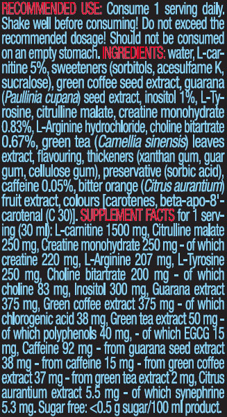 Съставки: Вода, L-карнитин 5%, подсладители (сорбитоли, ацесулфам К, сукралоза), екстракт от семена от зелено кафе, екстракт от семена на гуарана (Paullinia cupana), инозитол 1%, L-тирозин, цитрулинемалат, креатин монохидрат 0,83%, L-аргининхидрохлорид, холин битартрат 0,67%, екстракт от листа на зелен чай (Camellia sinensis), ароматизатори, сгъстители (ксантанова смола, гума гуар, целулозна смола), консервант (сорбинова киселина), кофеин 0,05%, плодов екстракт от горчив портокал (Citrus aurantium), оцветители [каротини, бета-апо-8'-каротенал (С 30)].
