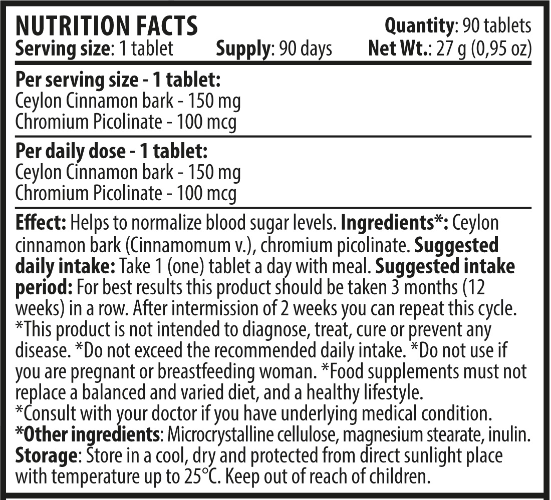 Съставки: Цейлонска канела кора, хром пиколинат.