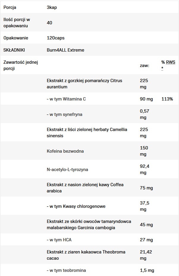 Екстракт от горчив портокал, стандартизиран да съдържа 40 % витамин С и 0,25 % синефрин - синефринът заедно с октопамина, кофеина и полифенолите на зеления чай влияе върху процеса на липолиза, като от една страна увеличава освобождаването на мастни киселини от адипоцитите, а от друга - увеличава енергийния разход на системата и засилва изгарянето им в клетъчните митохондрии.