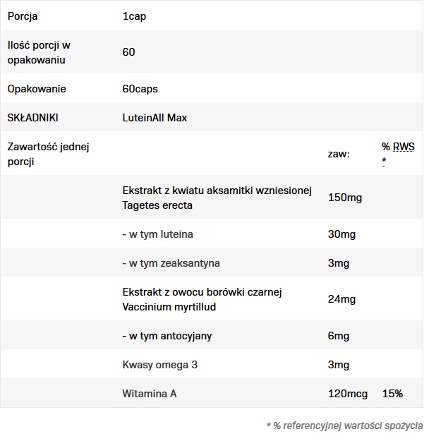 LUTEINALL MAX е хранителна добавка, предназначена за физически активни хора, на основата на екстракт от цветовете на Tagetes erecta и екстракт от плодовете на боровинка vaccinium myrtillus, обогатена с омега 3 киселини и витамин А.
