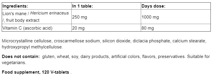 Съставки: екстракт от гъба лъвска грива, витамин С