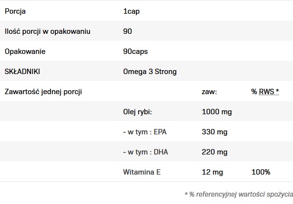OMEGA-3STRONG съдържа масло от океанска риба, което снабдява организма с незаменими мастни киселини от групата на омега-3. Ейкозапентаеновата киселина (EPA) и докозахексаеновата киселина (DHA) допринасят за правилното функциониране на сърцето. Благоприятният ефект се проявява в случай на консумация на 250 mg EPA и DHA дневно. Докозахексаеновата киселина (DHA) допринася за поддържането на нормално зрение и нормална мозъчна функция. Благоприятният ефект се проявява в случай на консумация на 250 mg DHA на ден.