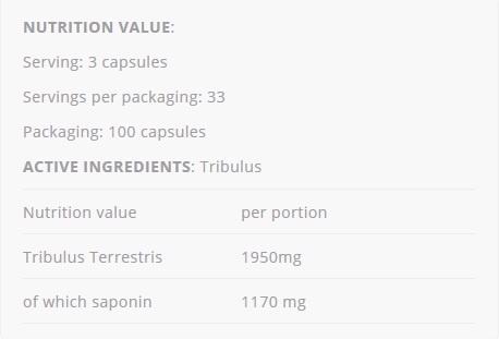 Tribulus Terrestris е адаптогенно растение, което стимулира ендокринната система. Активната съставка на растението, сапонин, подпомага процеса на производство на протеини, както и мускулната издръжливост. Смята се, че има свойства за повишаване на либидото и енергията и може да поддържа съня в..