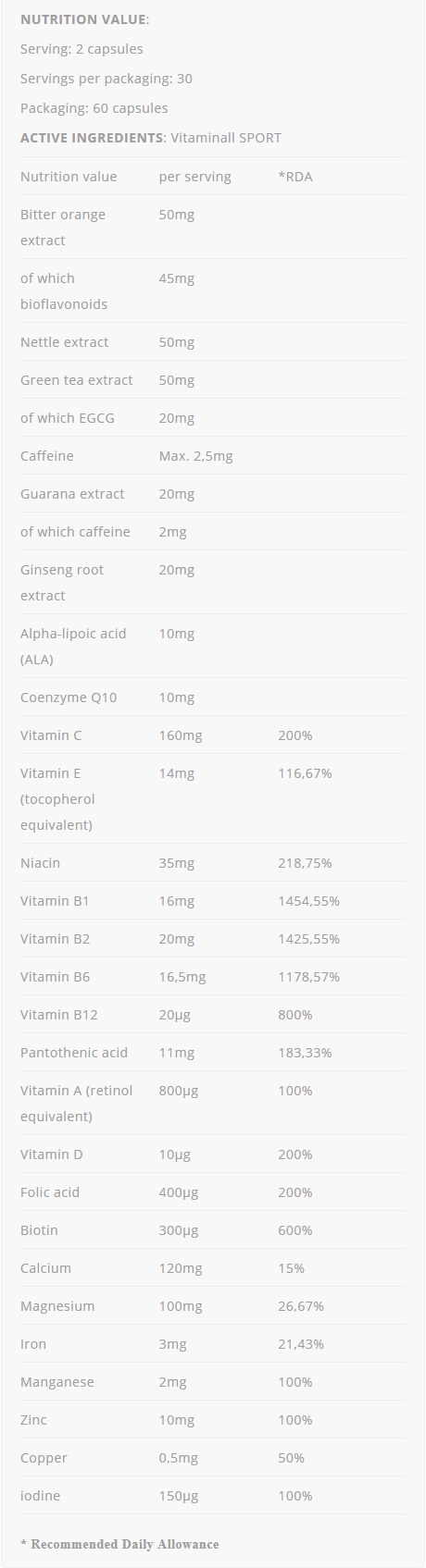 ALLNUTRITION VITAMINALL SPORT допринася за поддържане на добро здраве благодарение на съдържанието на коприва (копривата подпомага правилното функциониране на имунната система) и поддържа доброто настроение благодарение на наличието на горчив портокал. Продуктът е предназначен за хора, чийто ежедневен хранителен режим изисква попълване на запасите от витамини и минерали, включително физически активни лица* и спортисти* (*съдържащият се в продукта женшен спомага за поддържане на издръжливост на необходимото ниво). Внимателно разработената формула съдържа подбрани витамини и минерали в специално подбрани съотношения, както и екстракти от коприва, горчив портокал, зелен чай, женшен, коензим Q10 и алфа-липоева киселина (ALA).