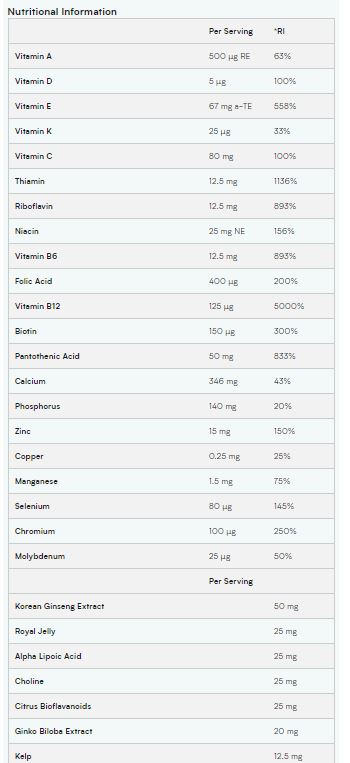 Съставки: ди-калциев фосфат, набухвател (микрокристална целулоза), калциев карбонат, антислепващ агент (стеаринова киселина, магнезиев стеарат, силициев диоксид), калциев аскорбат, магнезиев оксид, витамин Е, холин битартрат, пантотенова киселина, екстракт от корейски женшен (10:1), калиев хлорид, глазиращ агент (хидроксипропилметилцелулоза), ниацин, алфа-липоева киселина, пчелно млечице (3:1), цитрусови биофлавоноиди, L-селено метионин, келп на прах, екстракт от гинко билоба (50:1), цинков оксид, тиамин, витамин В6, бета-каротин, рибофлавин, екстракт от листа на коприва (4:1), екстракт от гроздови семена (50:1) Инозитол, Бромелаин, Липаза, Папаин, Боракс, Манганов сулфат, Амилаза, Ко-ензим Q10, Витамин D3, Лутеин, Меден сулфат безводен, Натриев молибдат, Хромов хлорид, Витамин К, Фолиева киселина, Биотин, Витамин B12