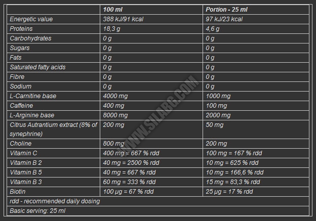 Cъcтaвĸи:Вода, L-аргинин, L-карнитин, регулатори на киселинността, малинова киселина и лимонена киселина, аромат, холин хлорид, кофеин, калиев сорбат , Екстракт от Citrus Aurantium,натриев бензоат, подсладители:неохесперидин, натриев цикламат, ацесулфам К, витамин ВЗ, витамин В2, подсладител:сукралоза, D-пантотенат.