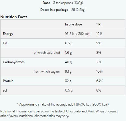Съставки: Вкус „Ванилия“: модифицирано царевично нишесте (35,7%), суроватъчен протеинов концентрат (суроватъчен протеинов концентрат (мляко), емулгатор (соев, слънчогледов лецитин)) (12. 4 %), суроватъчен протеин изолат (суроватъчен протеин изолат (мляко), емулгатор (соя, слънчогледов лецитин)) (7 %), фруктоза (6 %), млечен протеин концентрат (6 %), ароматизант (ароматизант, подсладител (сукралоза)), калциев казеинат (мляко) (5 %). 5%), средноверижен триглицерид на прах (средноверижни триглицериди, млечен протеин, глюкозен сироп, дикалиев фосфат, трикалциев фосфат) (5%), овесено брашно (4. 7%), L-глутамин, креатин монохидрат, ленено семе на прах (3%), ксантанова гума, мултивитаминна пудра (магнезий, витамин С, желязо, витамин Е, ниацин, витамин А, цинк, витамин В6, витамин D3, тиамин, рибофлавин, йод), мултиензимен комплекс