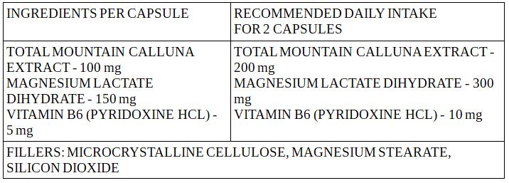 Съставки: Екстракт от Планинска калуна, Магнезиев лактат дихидрат, Витамин В6 (ПИРИДОКСИН HCL), Микрокристална целулоза, Магнезиев стеарат, Силиконов диоксид