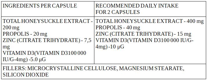 Съставки: Екстракт от Орлови нокти, Прополис, Цинк (ЦИТРАТ ТРИХИДРАТ), Витамин D3 (ВИТАМИН D3100 000 IU / G), Микрокристална целулоза, Магнезиев стеарат, Силиконов диоксид