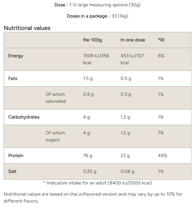 Съставки: Мицеларен казеин (мляко) (95%), ароматизатор, подсладител (сукралоза)