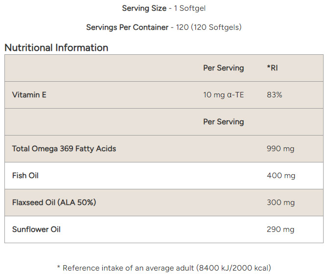 Съставки: Омега-3 рибено масло (ейкозапентаенова киселина 18%), докозахексаенова киселина 12%), ленено масло (ALA 50%), слънчогледово масло, софтгел (желатин, глицерол, пречистена вода), антиоксидант (витамин Е)