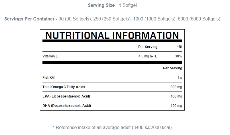 Съставки: омега-3 рибено масло, софтгел обвивка (говежди желатин, влагозадържащ агент (глицерол)), антиоксидант (D-алфа-токоферол), рафинирано соево масло.