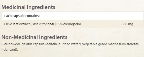 Съставки: Екстракт от маслинови листа (Olea europaea), Ориз на прах, желатинова капсула (желатин, пречистена вода), магнезиев стеарат (растителен клас)