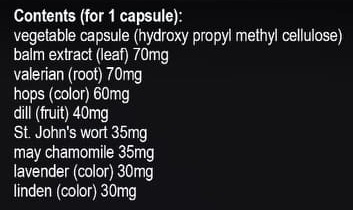 Съставки: Екстракт от маточина лист 210мг, корени от валериана 210мг, хмел цвят 180мг , копър плод 120мг, жълт кантарион 105мг, майска лайка 105мг, лавандула цвят 90мг и липа цвят 90мг