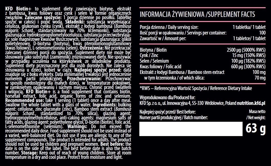 Biotin+ от KFD е първокласен комплекс от съставки, подходящ за хора, които искат да се погрижат за поддържането на здравословното състояние на косата, ноктите и кожата си. Освен това, биотинът влияе върху правилното функциониране на щитовидната жлеза и панкреаса, подсилва имунната система и понижава нивото на глюкозата в кръвта. Biotin+ от KFD се препоръчва при чуплива коса, увредена от фризьорски процедури, при слаби, чупливи нокти и суха кожа.