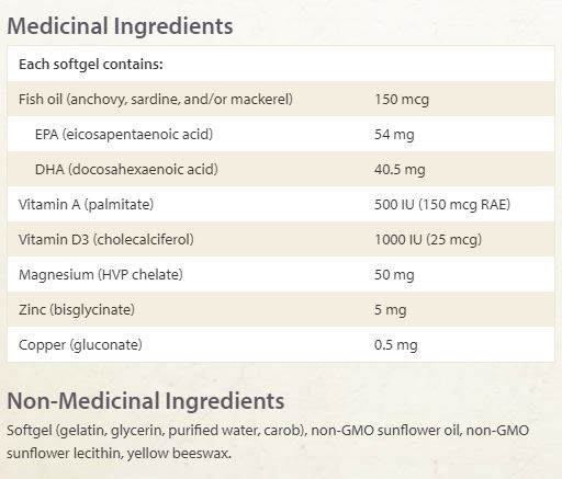 Съставки: Рибено масло (аншоа, сардина и/или скумрия), EPA (ейкозапентаенова киселина), DHA (докозахексаенова к-на), Витамин А (палмитат), Витамин D3 (холекалциферол), Mагнезий (HVP хелат), Цинк (бисглицинат), Мед (глюконат). Софтгел капсула (желатин, пречистена вода, глицерин, рожков), масло от соеви зърна, лецитин, пчелен восък)