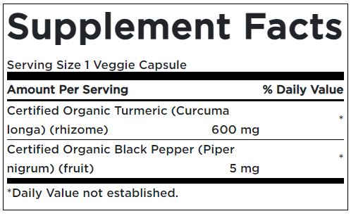 Съставки: Сертифицирана органична куркума (Curcuma longa) (коренище), Сертифициран органичен черен пипер (Piper nigrum) (плодове)