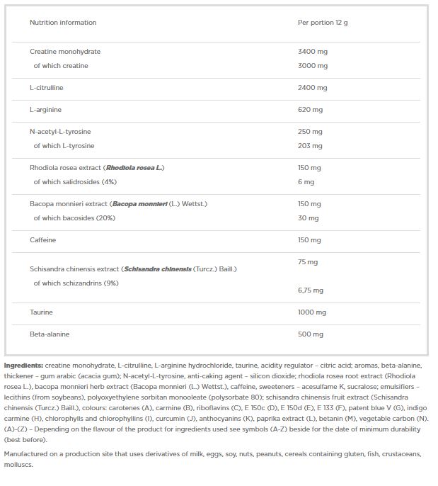 Съставки: креатин монохидрат, L-цитрулин, L-аргинин хидрохлорид, таурин, регулатор на киселинността - лимонена киселина; аромати, бета-аланин, сгъстител - гума арабика (акациева смола); N-ацетил-L-тирозин, средство против слепване - силициев диоксид; екстракт от корен на rhodiola rosea (Rhodiola rosea L.), екстракт от билка bacopa monnieri (Bacopa monnieri (L.) Wettst.), кофеин, подсладители - ацесулфам К, сукралоза; емулгатори - лецитини (от соя), полиоксиетилен сорбитан моноолеат (полисорбат 80); екстракт от плодове schisandra chinensis (Schisandra chinensis (Turcz.) Baill.), цветове: каротини, кармин, рибофлавини, E 150c, E 150d, E 133, патентово синьо V, индиго кармин, хлорофили и хлорофилини, куркумин, антоцианини, екстракт от червен пипер, бетанин, растителен въглерод
