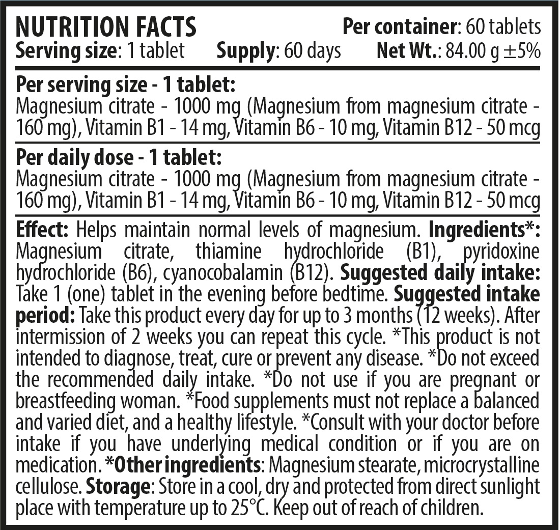 Съставки: Магнезиев цитрат, тиамин хидрохлорид (B1), пиридоксин хидрохлорид (B6), цианокобаламин (B12)